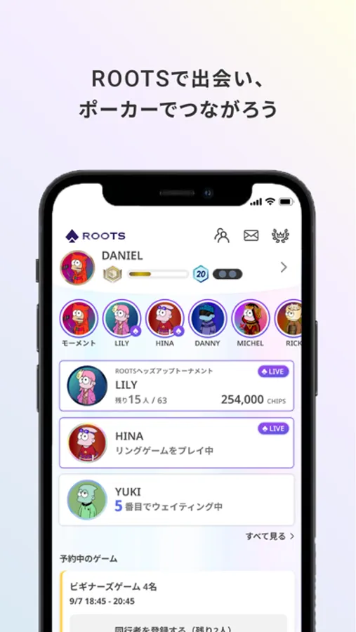 ROOTSで出会ったポーカープレイヤーとフレンド登録することができます。フレンドになることで、お互いの予約状況やプレイ状況リアルタイムで確認できるようになります。