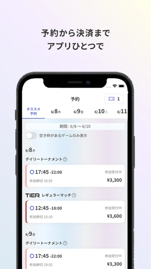 ROOTSで開催されるビギナーズゲームやトーナメントの予約、リングゲームのウェイティングリストへの登録ができます。