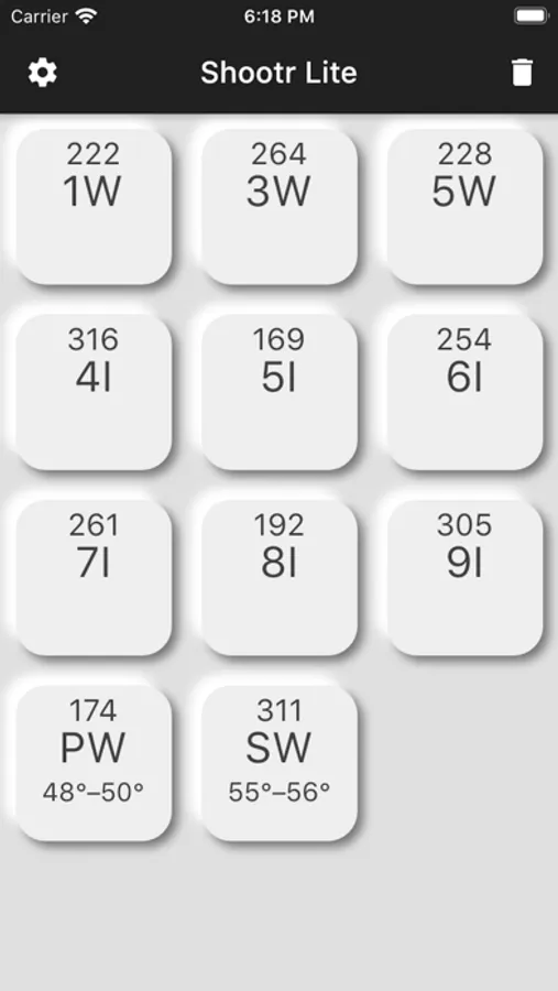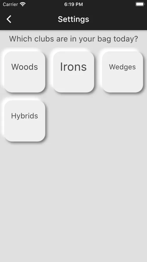 What's more is, you can change your clubs that's in your bag on that day! Just swipe to remove the clubs from your bag in the settings section and click on the '+' icon to add clubs. We support Woods, Irons, Wedges and Hybrids. For easier removal from the home screen, long press on a club button on the home screen until a red circle shows up. Then simply remove clubs that way. Long press a club button again to finish.