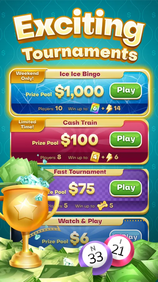 We ensure that all tournaments are fair and competitive by matching players according to skill levels -- All tournament players get the same bingo numbers and bonuses so YOU WIN as a result of SKILL in a FAIR playing field. It’s all about YOU and your talent!