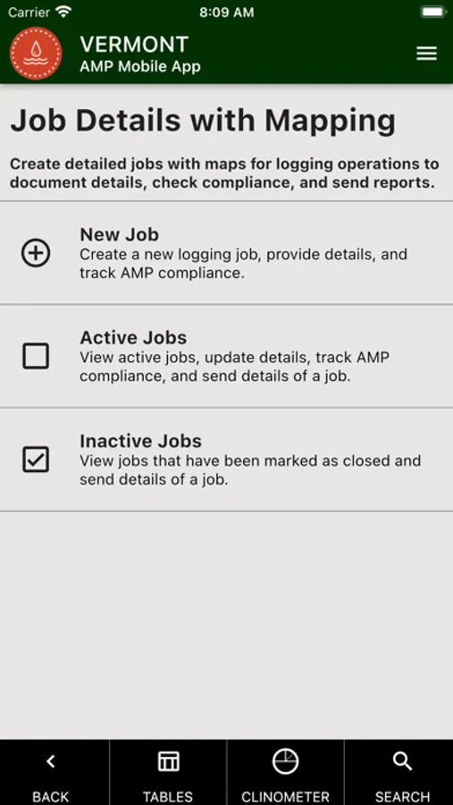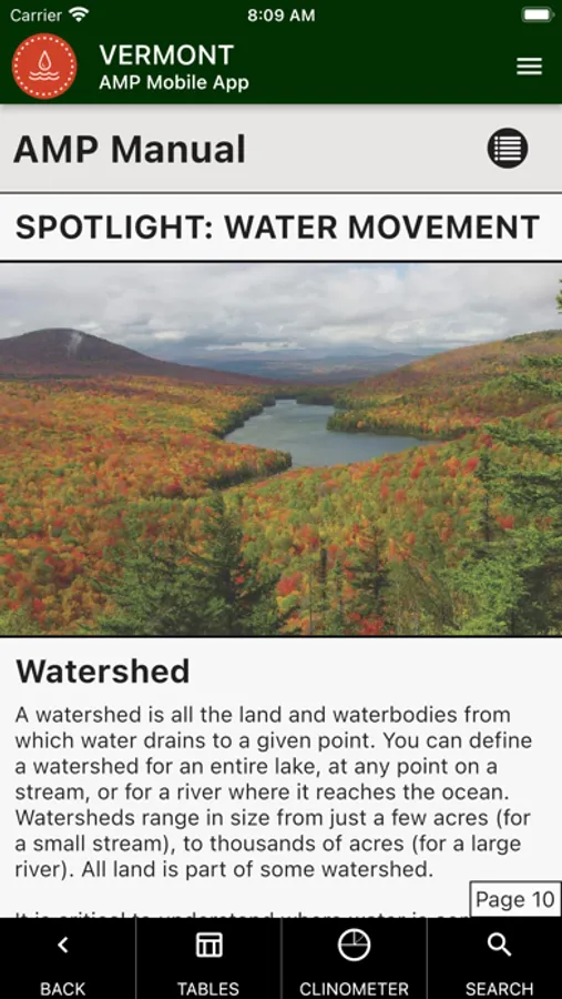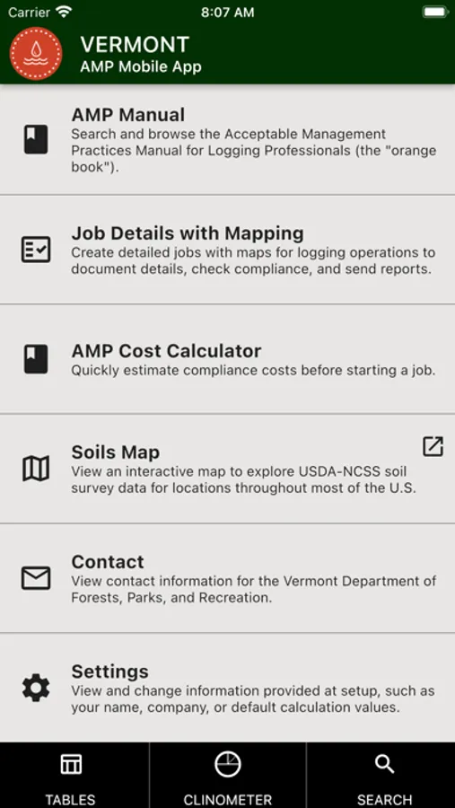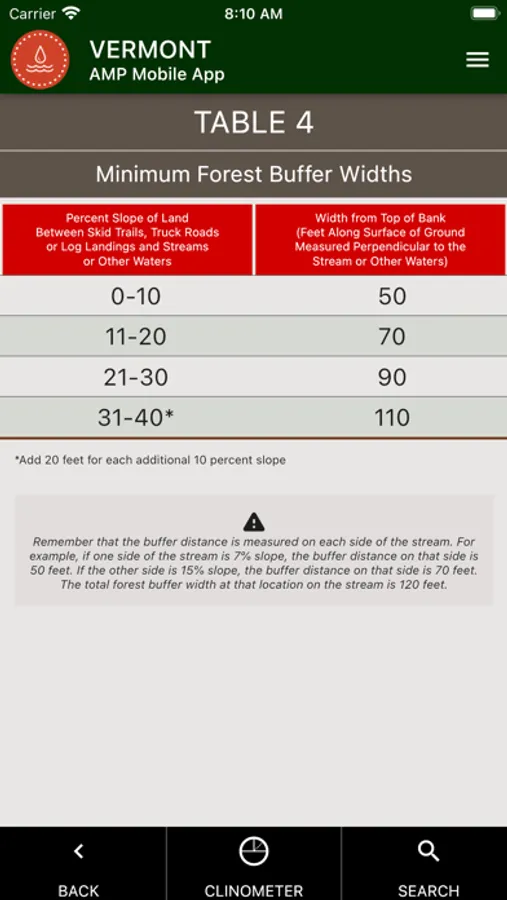 The AMP mobile app from the Vermont Department of Forests, Parks, and Recreation provides a digital version of the Acceptable Management Practices Manual for Logging Professionals as well as several tools to assist in estimating and tracking water quality compliance practices.