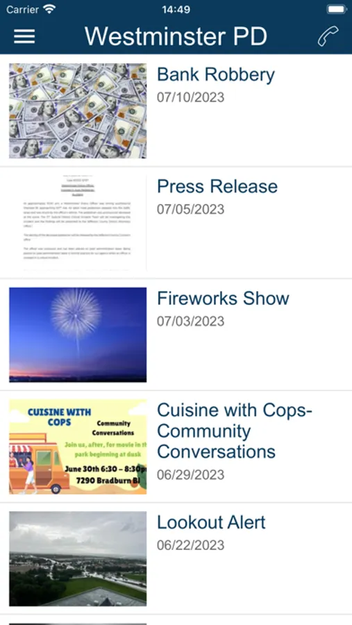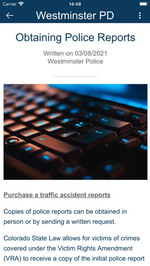 The Westminster Police Department (CO) was created to provide the community with Breaking News, Community Resources, Safety Information & More. Through the app, community members can connected resources, learn about what is happening in their area and view news articles. All information is published directly by the Westminster Police Department.