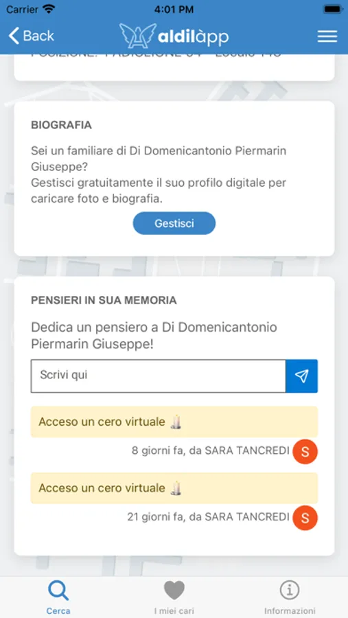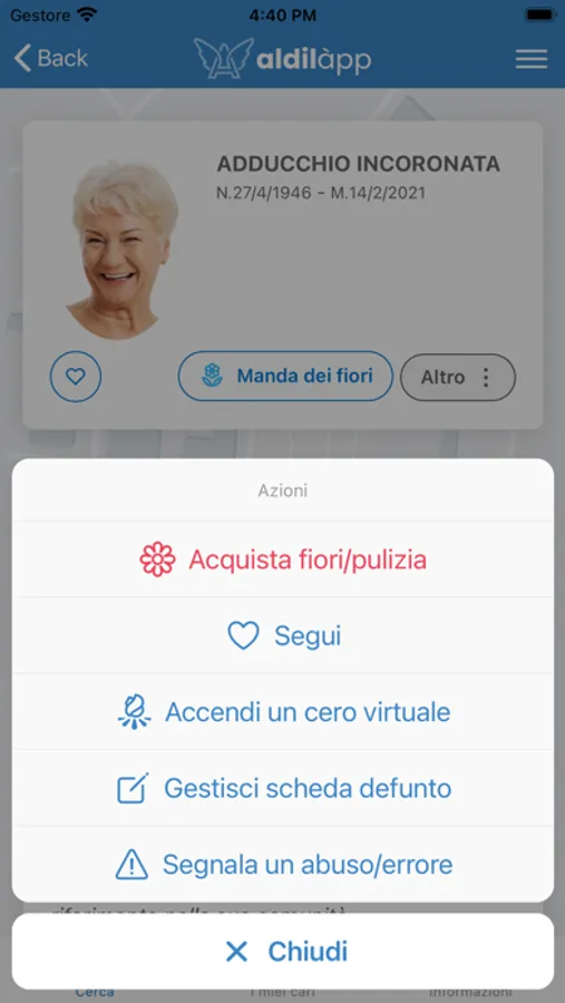 With Aldilapp users can order fresh flowers and/or other services such as cleaning the headstone of their deceased, they can write a thought/a dedication, light a virtual candle, upload a photo or a biography.