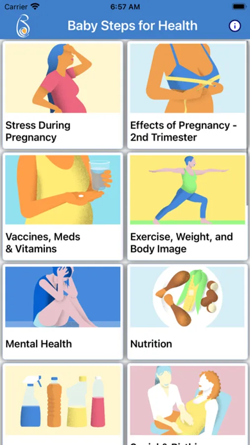 The Smartphone App covers wellness topics that are of special interest to pregnant women and mothers of newborns. These topics change with each stage of pregnancy and postpartum. You’ll find information, tips, and resources for dealing with issues like pregnancy side effects, stress, depression, sleep, work, smoking, weight, and tips to help with insurance, and transportation.