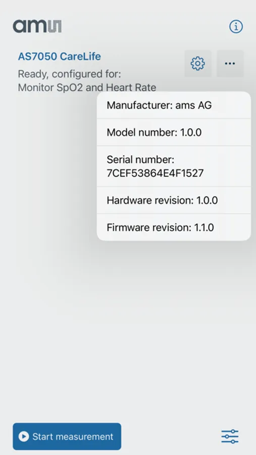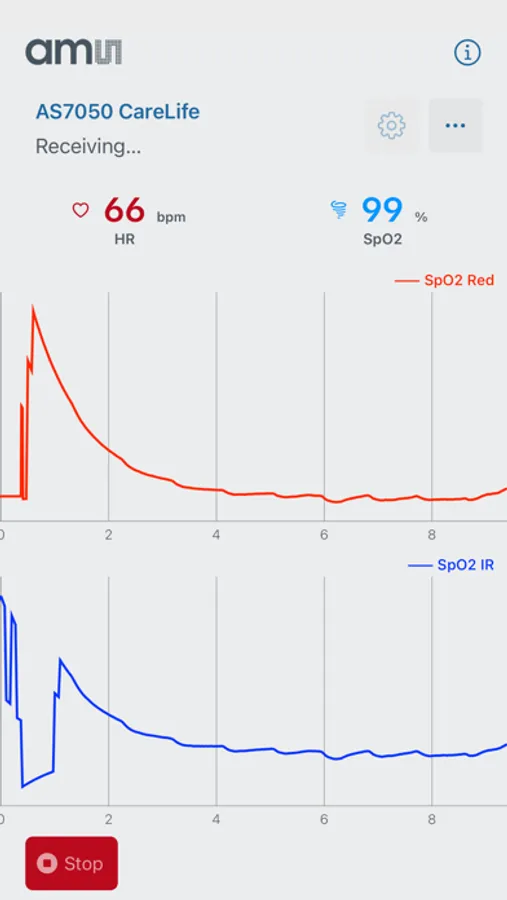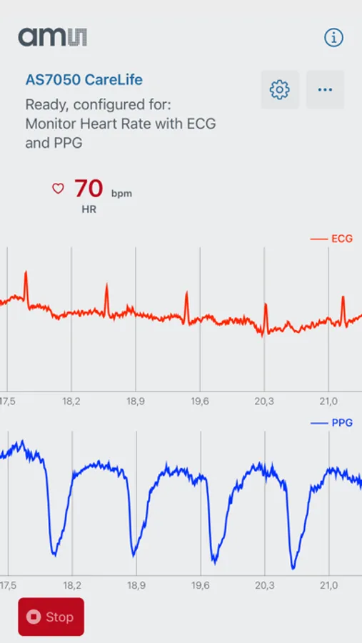 This BLE-enabled app connects to ams AS7050 based CareLife device and displays the real-time readings.