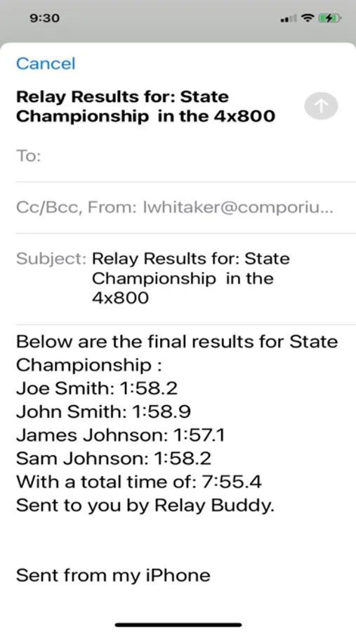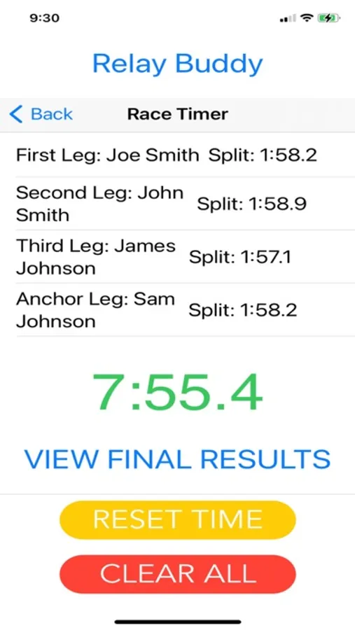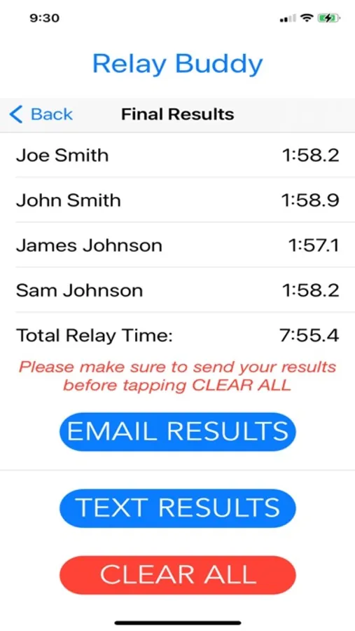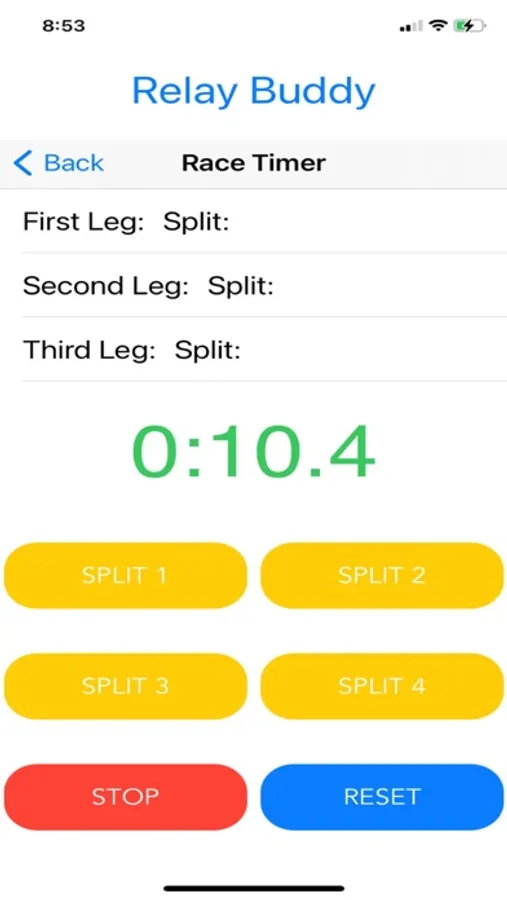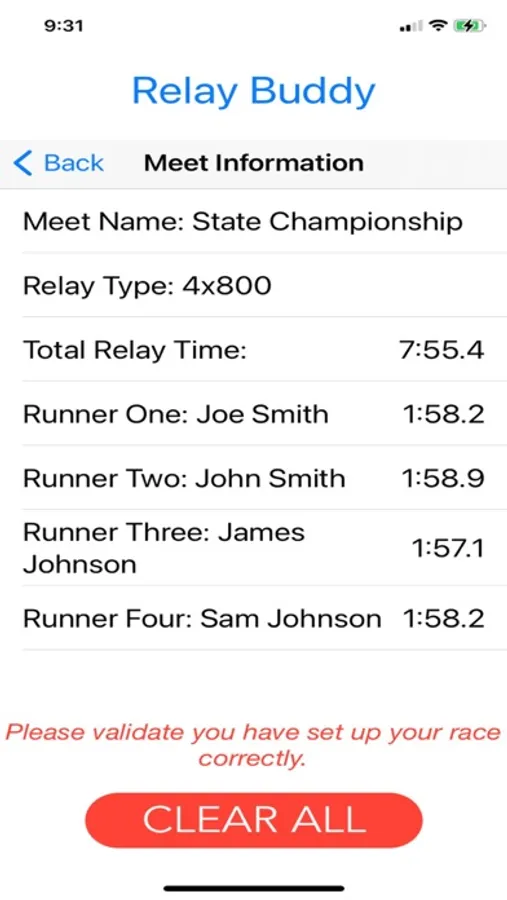 Relay Buddy is a race timer designed for standard track relay events and also tracking and predicting 800m race performance. Relay Buddy allows input for 4x100, 4x200, 4x400, 4x800, and the DMR. In addition, 800m times and ideal splits for each 200m segment can be predicted based on 400m time trial results. This app is a must-have for parents, coaches, athletes, and anyone who loves track meets! For relays, Relay Buddy allows users to input the meet name and team member names so that each athlete's segment time can be recorded along with the total relay time. For the 800m individual race, times and splits can be estimated, recorded, and analyzed. All results and analysis of the events can be emailed or sent by text to anyone the user chooses. This is a simple to use and straightforward app that tracks exactly what parents, coaches, and athletes want to know for their relay races and 800m races! Be on the lookout for continued enhancements and additions to line our products!