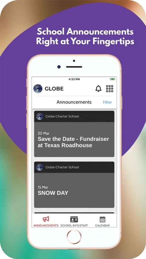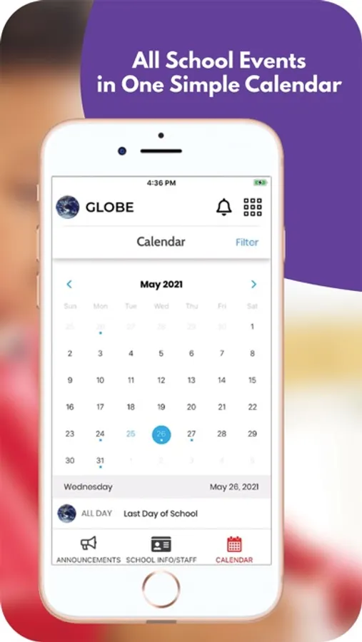 The app includes information for the district and all schools. Filter by the school your child attends to feature information for that school.