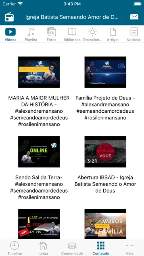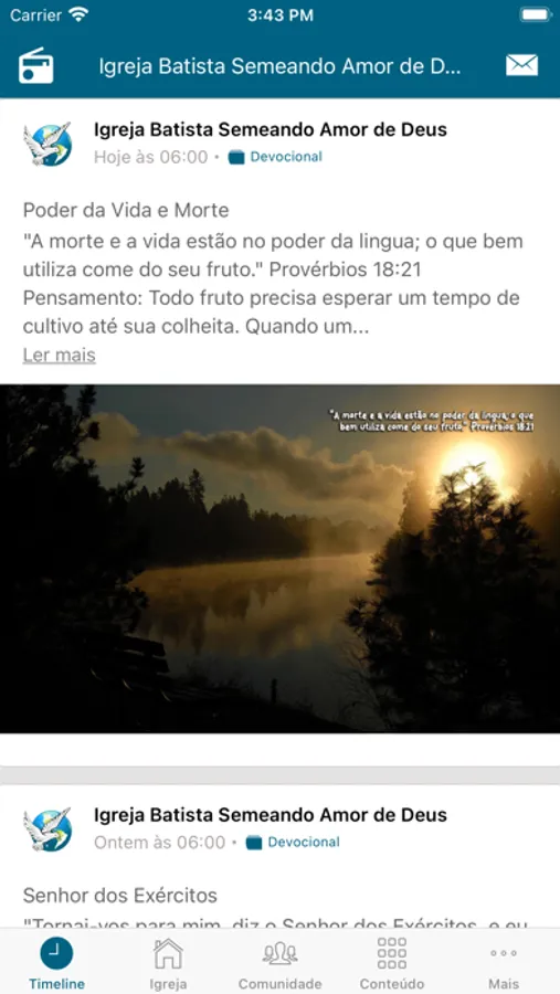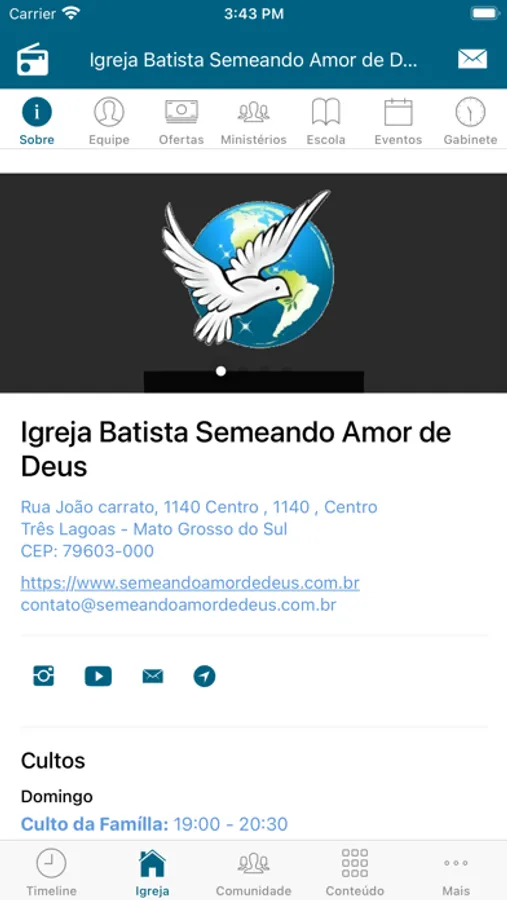 - Informações da Igreja (endereço, telefone, site, redes sociais, pastores)