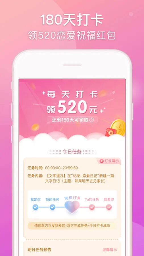 情侣双方连续180天对对方说我爱你+完成指定任务,即可领取520元恋爱祝福红包哦,一起来参加挑战吧~