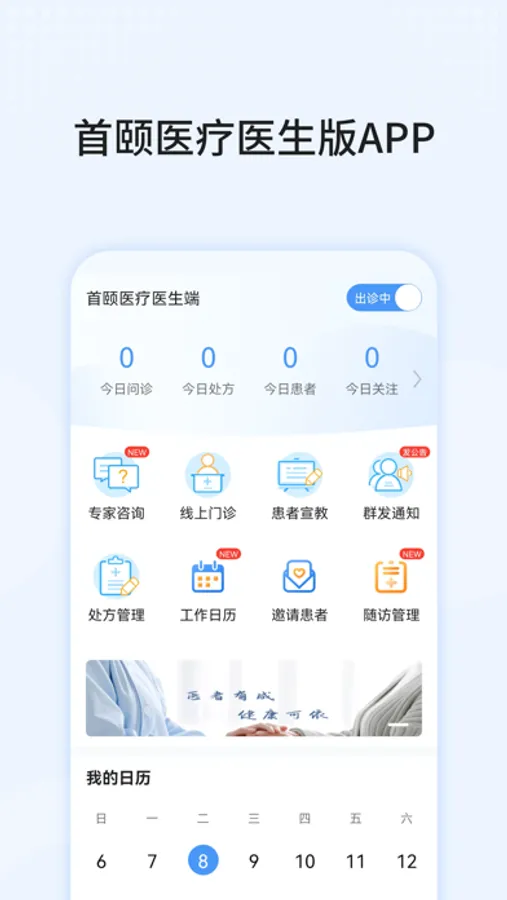 首颐医疗医生端APP为医生提供移动办公,支持线上复诊、患者管理、随访管理等功能。