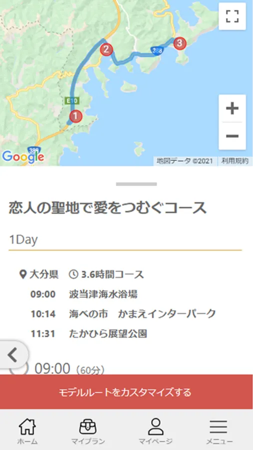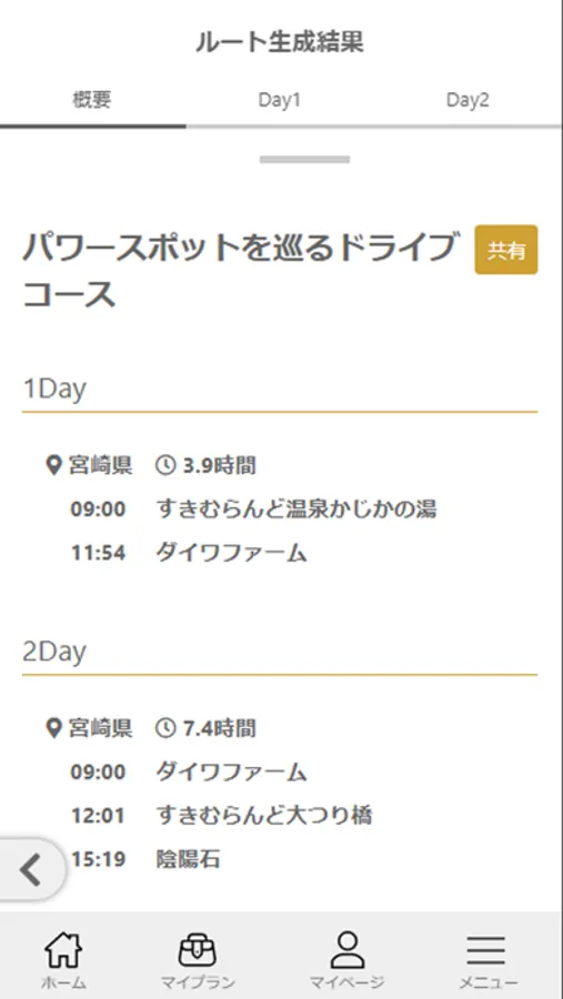 ルートだけでなく、移動時間や日を跨いでの観光ルートも提案できます。