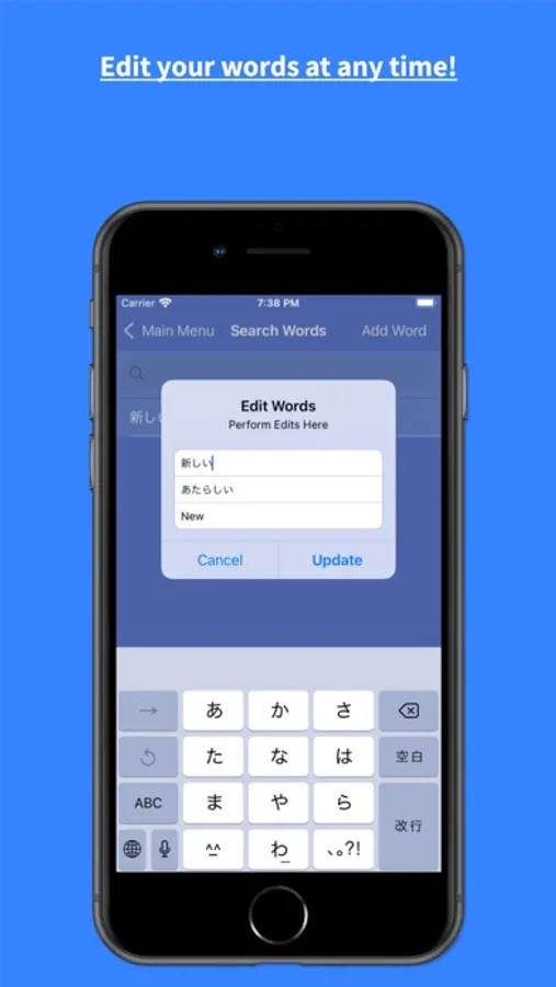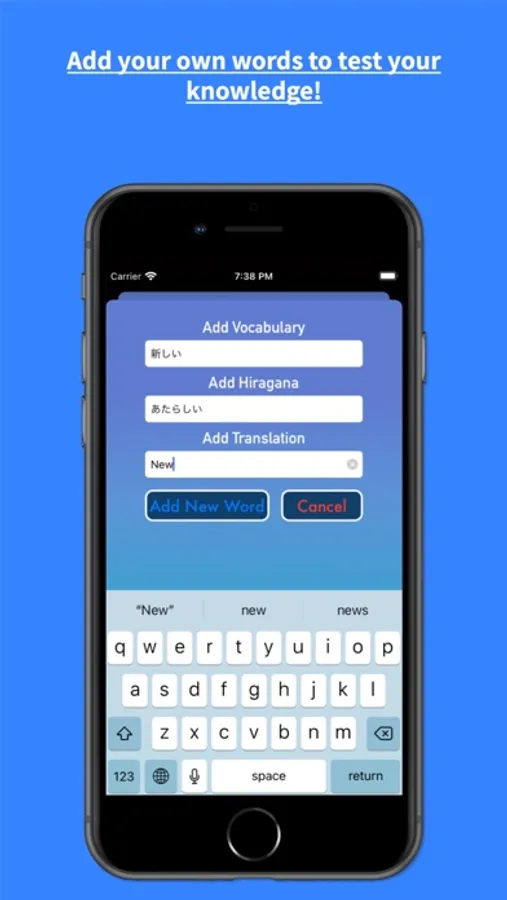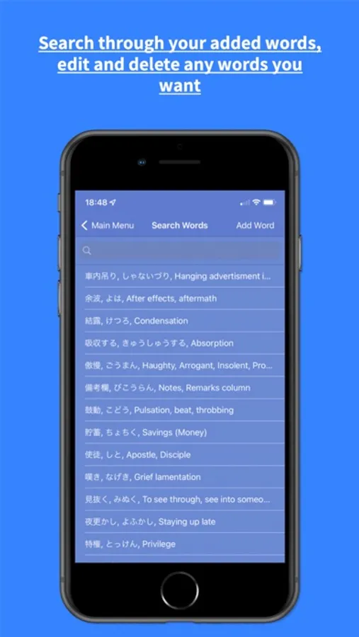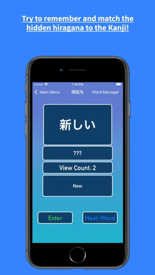 It’s about remembering the hiragana equivalent of different Kanji, however this time, you can choose what words you want to review, by adding whatever words you want. You can add as many words as you like in the app and cycle through them at random to test your memory skills.