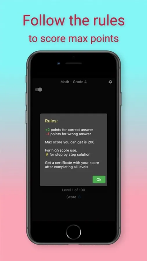 There are 100 questions/levels sprinkled with some interesting Math puzzles in between. Create and share a certificate of your final score. Challenge your friends and family to see who can score the most.