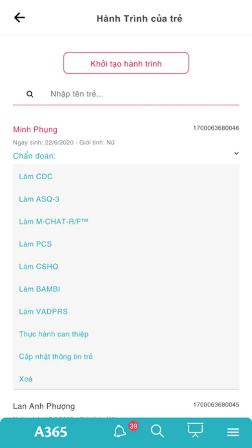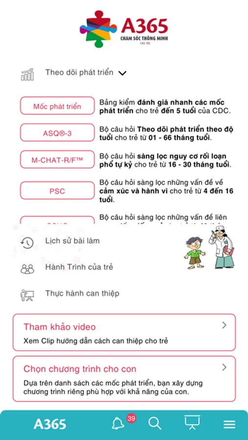 SÀNG LỌC: Bao gồm các bộ công cụ đánh giá trực tuyến nhằm theo dõi sự phát triển của trẻ và phát hiện sớm trẻ có nguy cơ rối loạn phát triển và rối loạn phổ tự kỷ.