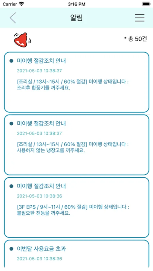 - 전기 사용량, 사용 요금, 절감 항목별 사용량이 설정된 수치를 넘었을 시 알림 발송
