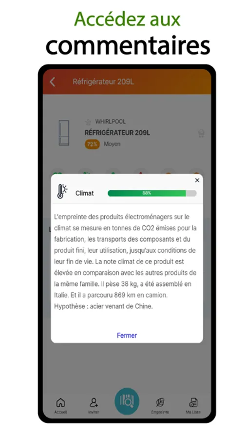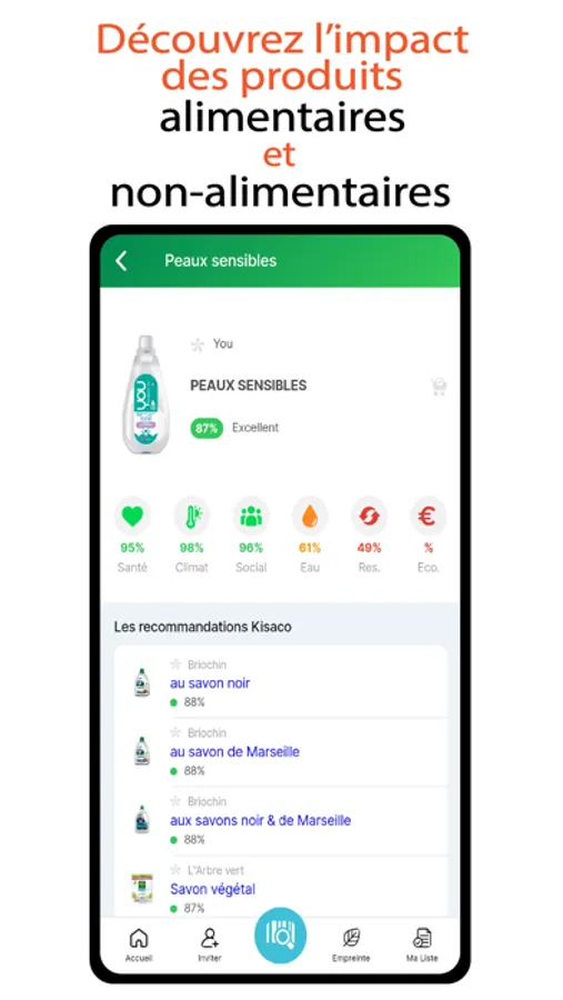Découvrir l’impact d’un produit grâce à une notation qui va de 0 à 100 et des commentaires explicatifs. Accéder à des produits alternatifs !