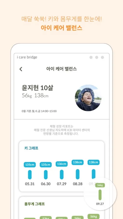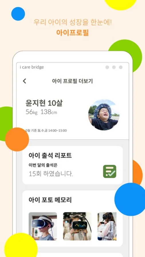 - 아이케어브릿지 앱은 학부모님께 아이의 출석현황, 프로그램 시간표, 활동사진부터 ICB 성장 데이터와 각종 제휴·프 로모션에 관한 정보를 제공합니다.