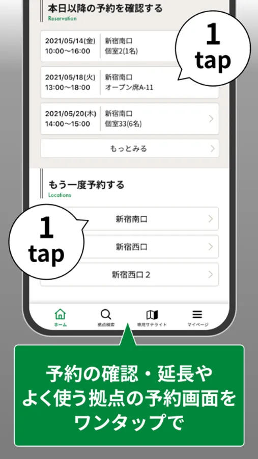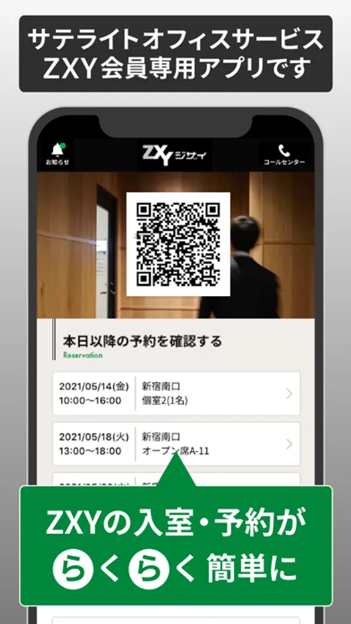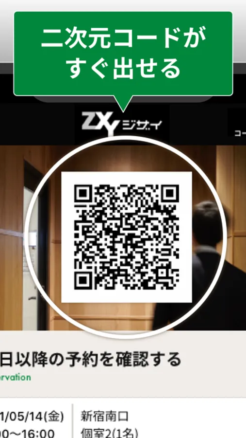 予約可能なZXYを地図上で検索、ワンタップで入退室用二次元コードを表示するなど、