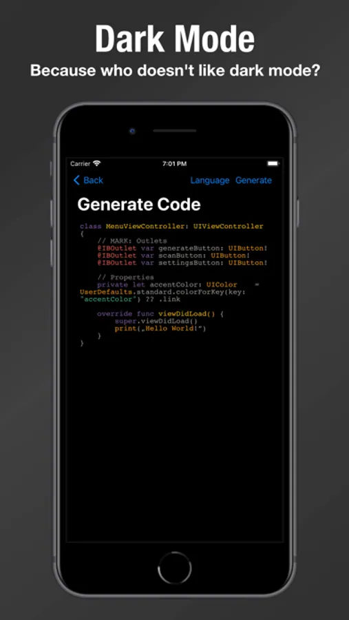 - Syntax coloring of the generated/scanned code (depending on the language that can be selected),