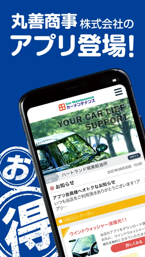 当社のアプリ「丸善商事カーメンテナンスアプリ」ではアプリで簡単に洗車・コーティングなどのご予約や愛車のメンテナンス管理が可能の他、ご登録いただいた店舗で利用いただけるお得なクーポンや各種メニューの割引情報を配信しております。