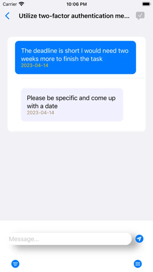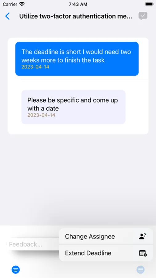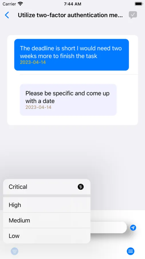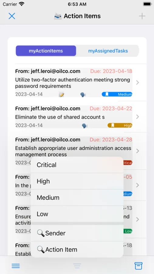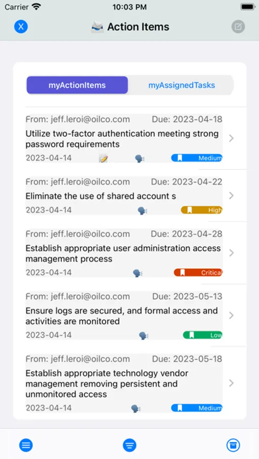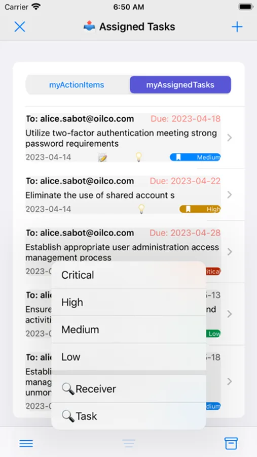 Split your Tasks into Action Items and assign each to team members (actions owners). Set the deadlines and the priority levels. Re-assign the Task if the current assignee is unable to perform it. Change the deadline and the priority level if the need arises (Task owner only). The Action owner signals the completion of the Action Item but the Task owner confirms the completion or returns it for more actions. Follow-up messaging for each Task (Action Item) to provide feedback. Push notifications for new Action Items and for the deadlines that have been reached. Filtering Action Items / Tasks, per priority level. Completed Action Items / Tasks are removed from the list ( permanently cleared or saved).