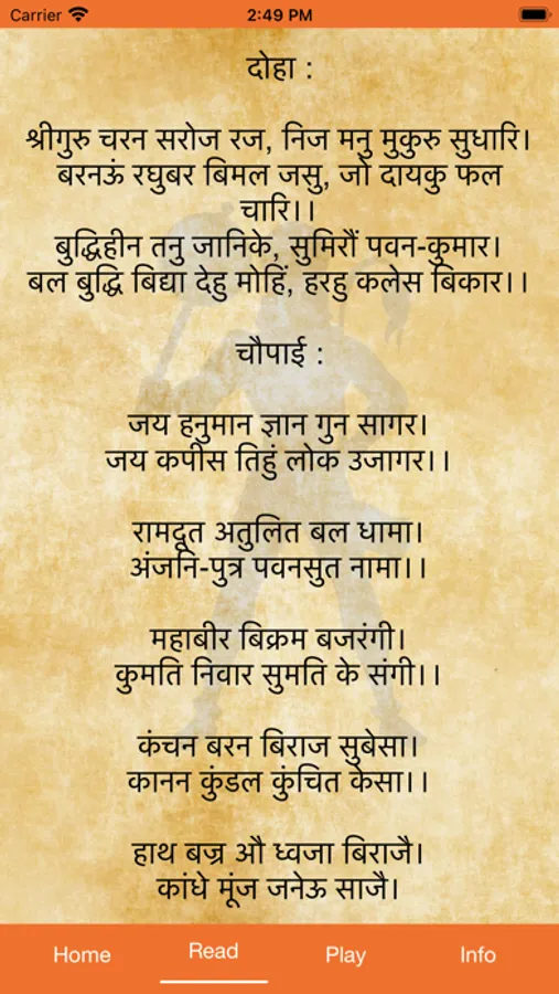 The Hanuman Chalisa (literally Forty chaupais on Hanuman) is a Hindu devotional hymn (stotra) addressed to Hanuman. It is traditionally believed to have been authored by 16th-century poet Tulsidas in the Awadhi language, and is his best known text apart from the Ramcharitmanas. The word "chālīsā" is derived from "chālīs", which means the number forty in Hindi, as the Hanuman Chalisa has 40 verses (excluding the couplets at the beginning and at the end).Hanuman Chalisa is a devotional hymn dedicated to Lord Hanuman.