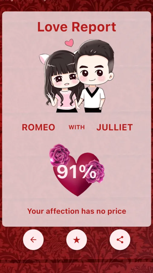 This app can be recognized as love meter, love calculator, love horoscope, name tester, birthday tester, photo tester, love quotes and so on.