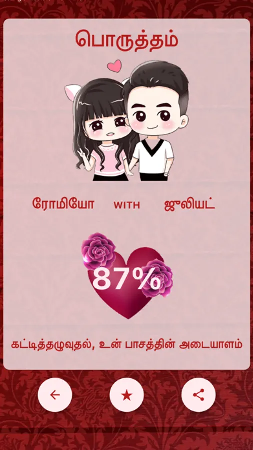 This app can test couple's matching based on names, dating dates, birthdays, photos and so on. This generates a report with matching percentage, relationship quotes and so on. This report can be shared in social media like Instagram, Twitter, Facebook, WhatsApp and so on.
