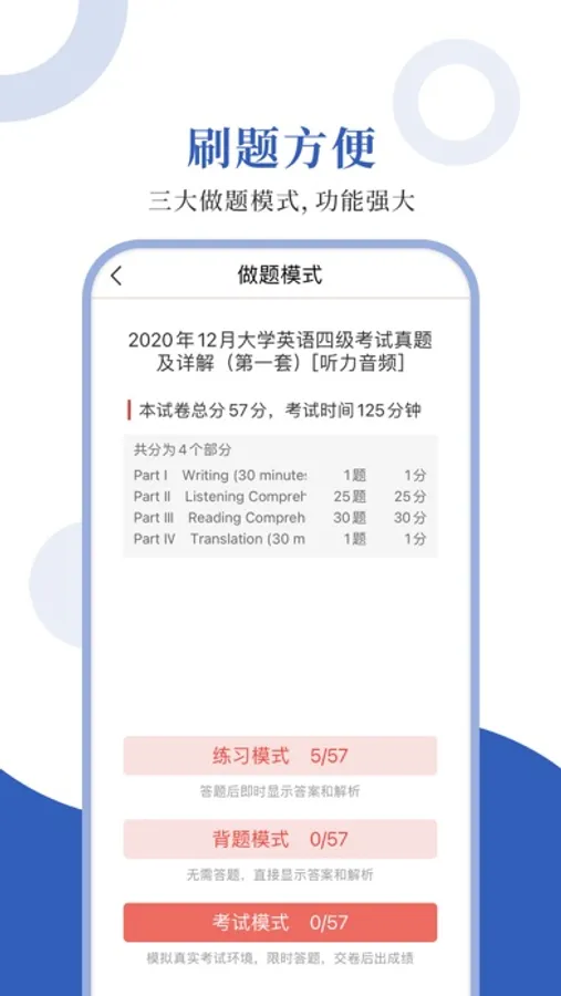 专为大学英语四级考试精心准备的考试配套题库,每一道试题都有答案解析,为考试提供了充分的复习准备,可随时随地学习练习,支持手机、平板多端同时使用。
