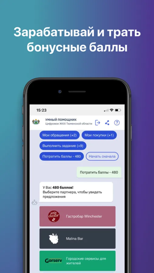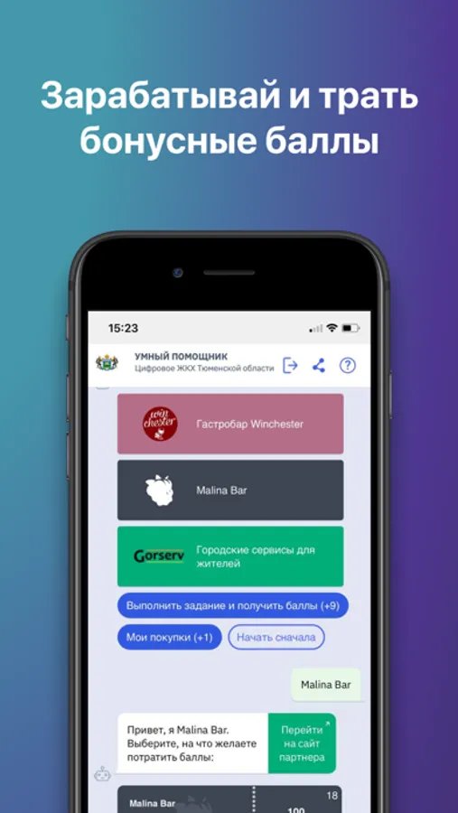 За активные действия в разделе «Выполнить задание» пользователю начисляются бонусные баллы, которые можно потратить на получение скидок у наших партнёров. Перечень партнеров и их предложения находятся в разделе «Потратить баллы».