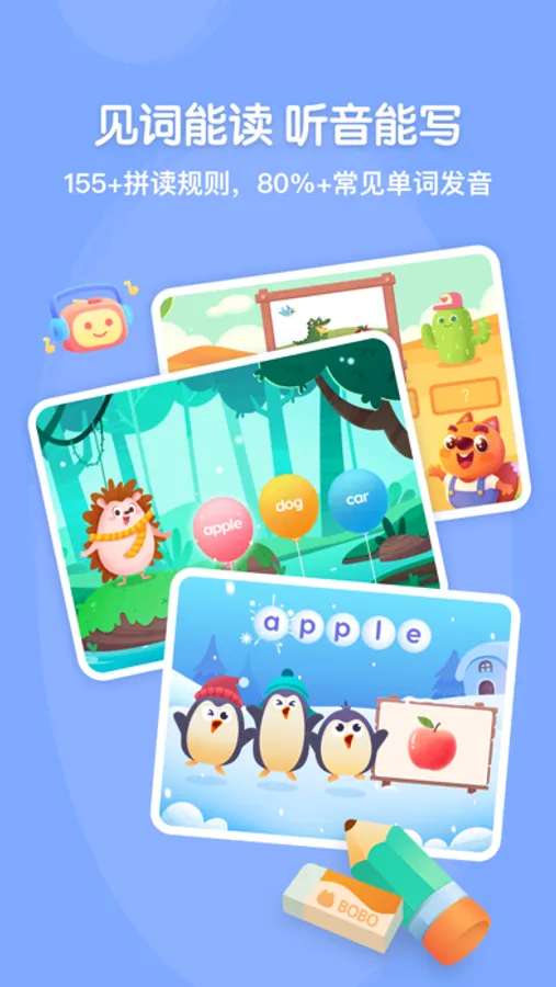 步步英语自然拼读,遵循6~10岁孩子认知和语言发展规律,通过科学的体系化内容,融合趣味游戏化互动方式及先进的AI技术,带孩子系统掌握“见词能读、听音能写”自然拼读基本规则,培养孩子的自主阅读能力。