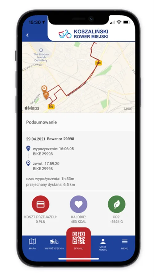 Oprócz tego będziesz w stanie zobaczyć ilość przejechanych kilometrów, zobaczyć przejechaną na rowerze trasę czy też sprawdzić poprawność zwrotu wypożyczonego roweru.