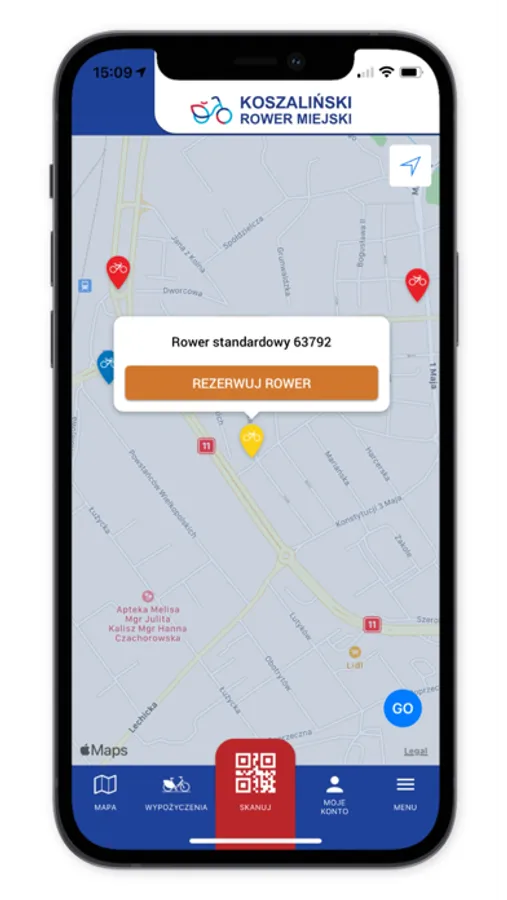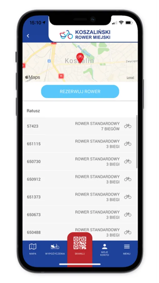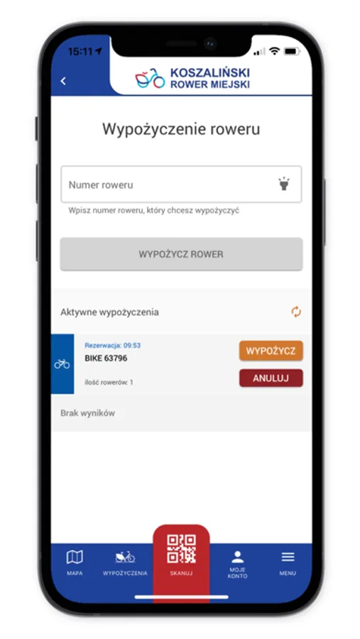 • Wypożyczenie roweru za pomocą skanu kodu QR lub wpisania numeru,