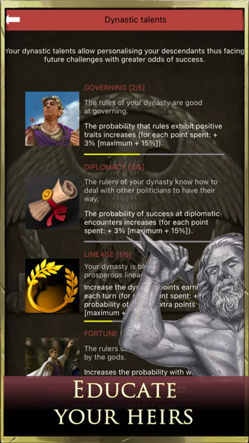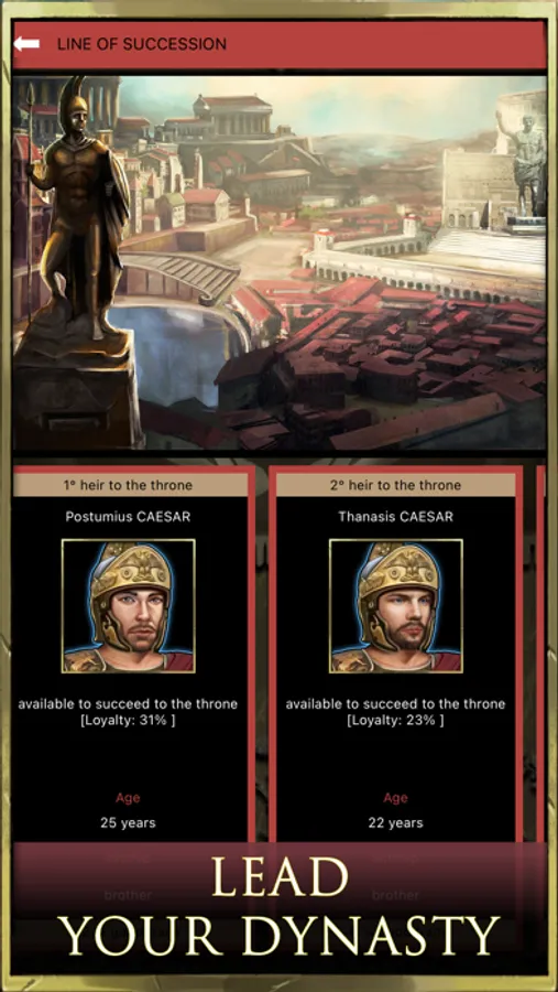 - dynasty and talented people: make your dynasty prosper under the command of your empire and prevent the establishment of the Roman Republic. Educate your heirs by strategically and tactically choosing talented people to train the future imperium to be a great conqueror and legendary emperor.