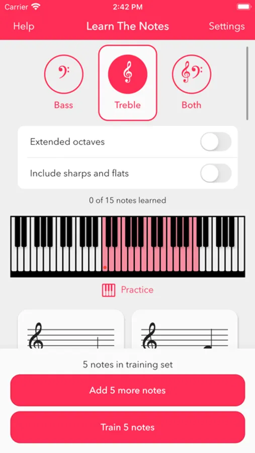 - Optionally include extended octaves (ledger lines) and accidentals (sharps and flats)