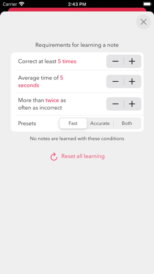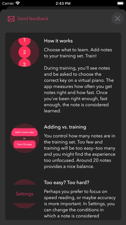 - Flexible training algorithm: you tell the app when to consider a note "learned"