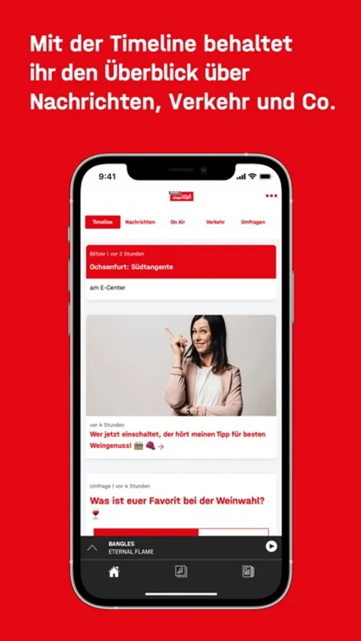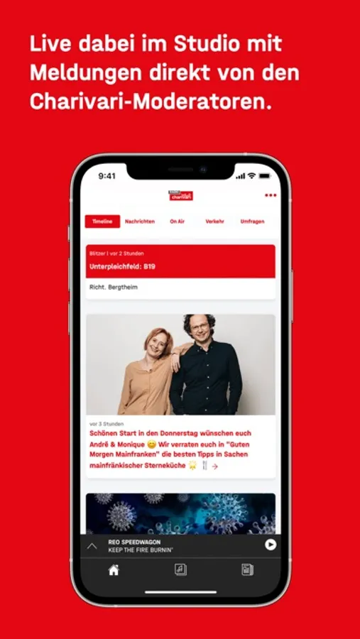 Timeline: Mit der Timeline behaltet ihr immer den Überblick. Hier sind aktuelle News aus Kitzingen, Main-Spessart und Würzburg, Verkehrsinformationen, Meldungen der Charivari-Moderatoren, Votings und mehr zusammengefasst.