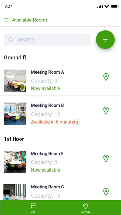 - Book a meeting room based on your preferences: you can filter based on availability, equipment, capacity or location!