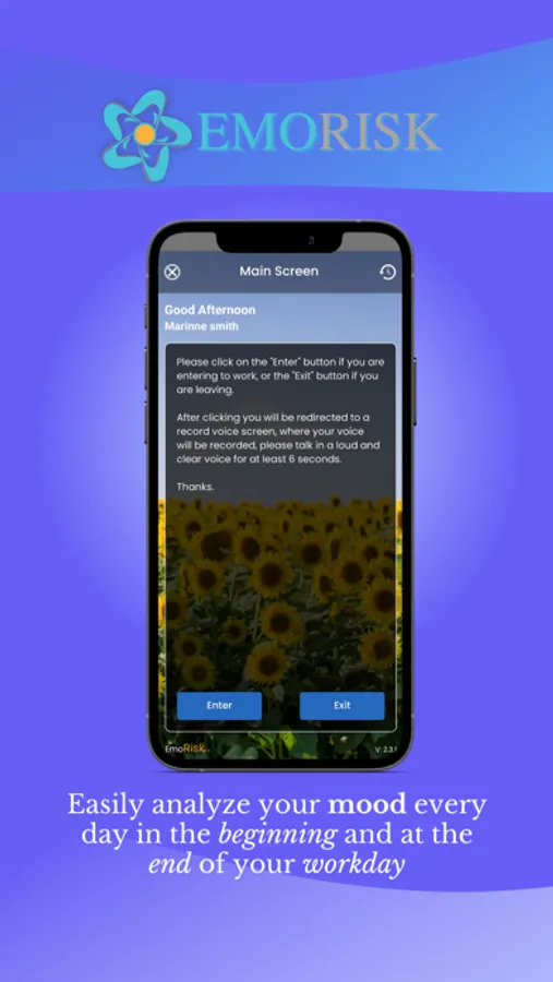 The EmoRisk system is based on the detection of daily emotions of employees when entering and leaving their workplace, providing a daily and monthly report, in addition to highlighting daily alerts or significant changes in the emotions and feelings of employees, allowing Organizations to identify the factors or foci that generate high levels of risk in employees, avoiding negative effects such as mental health problems, accidents or occupational diseases.