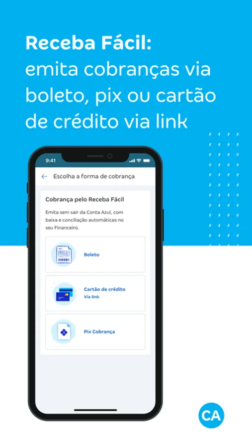 - Emita e compartilhe cobranças pelo Receba Fácil (boleto, pix, cartão via link).