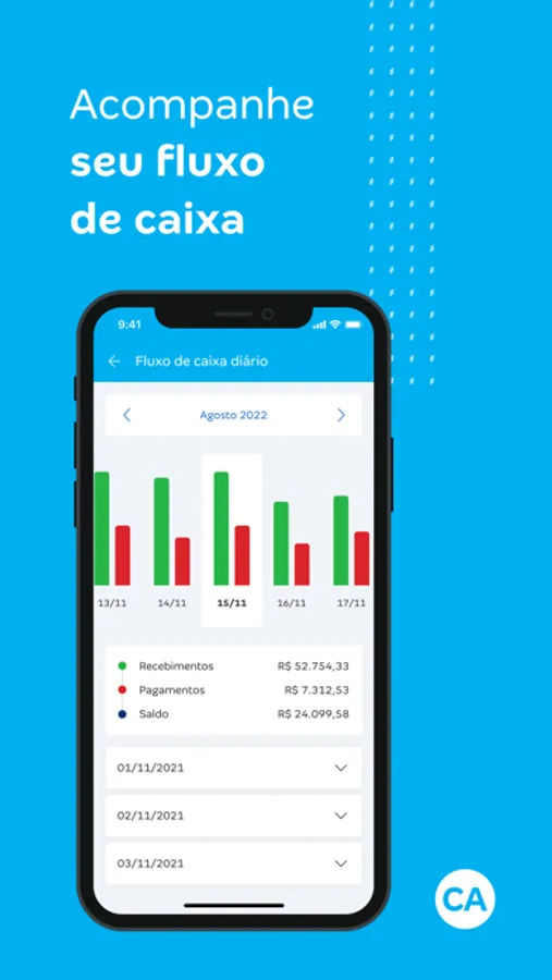 - Consulte o fluxo diário da sua empresa: saldo a receber, a pagar e em atraso;