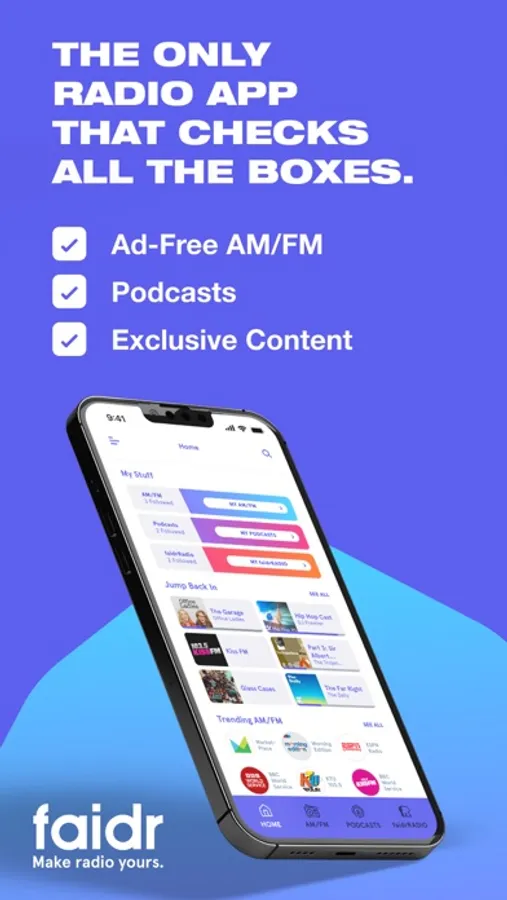 Welcome to faidr—the only audio app that combines commercial free AM/FM, podcasts, and exclusive music mixes and hosted shows.