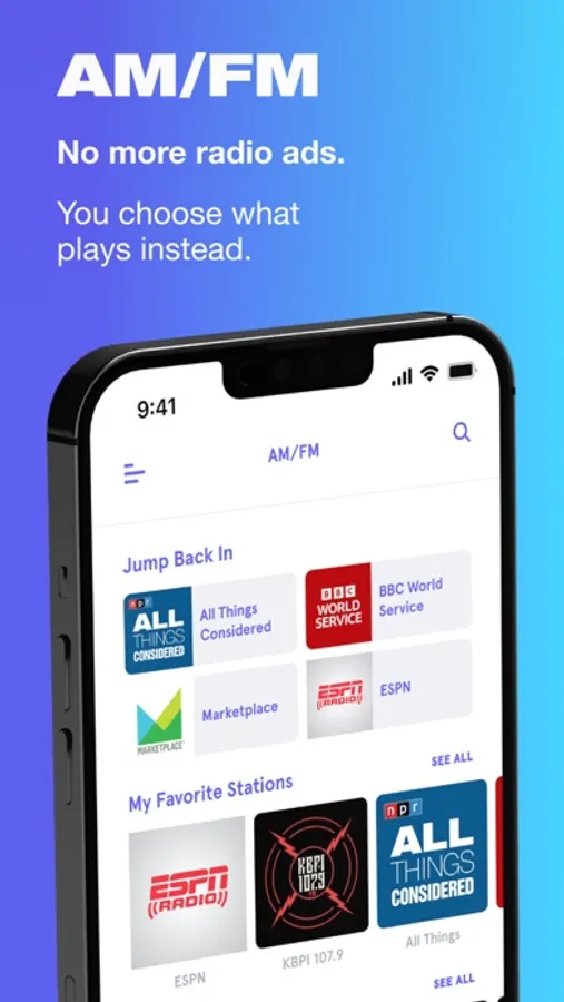 For subscribers listening to AM/FM stations, our technology automatically switches to a user’s preferred audio content during commercials, then returns you back to your station when the ad-break ends without missing a beat. We have over 5,000 live radio stations representing every major U.S. market, providing easy access to music, news, talk, sports and more. If we’re missing your station, we make it easy for you to notify us—and we’ll add it ASAP.