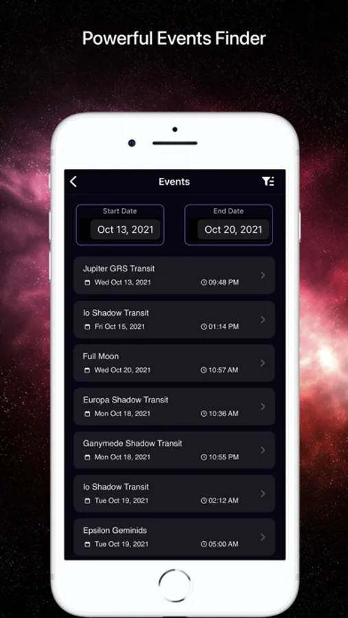 + Events Finder - go to the new Events section to unlock a powerful search engine that finds astronomical events visible tonight and far into the future. The finder dynamically generates a listing of moon phases, eclipses, planetary moon events, meteor showers and planetary phenomenon such as conjunctions, elongations and oppositions.