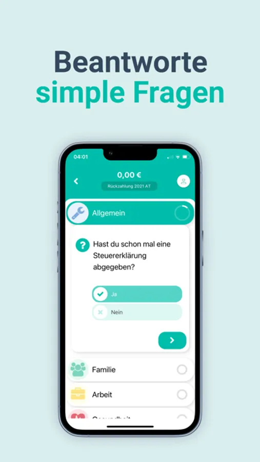 Bei uns ist alles einfach. Taxefy leitet dich spielerisch durch alle relevanten Fragen, rechnet dir automatisch deine Rückzahlung aus und überweist dir dieses auf dein Wunschkonto. Tippe dich gemütlich durch, in dem du Fragen beantwortest, wie in einem Gespräch mit einem Freund.