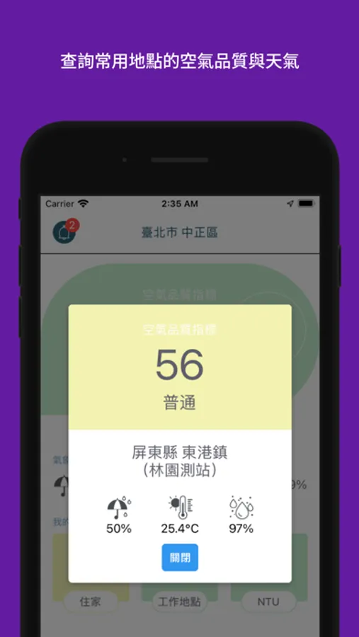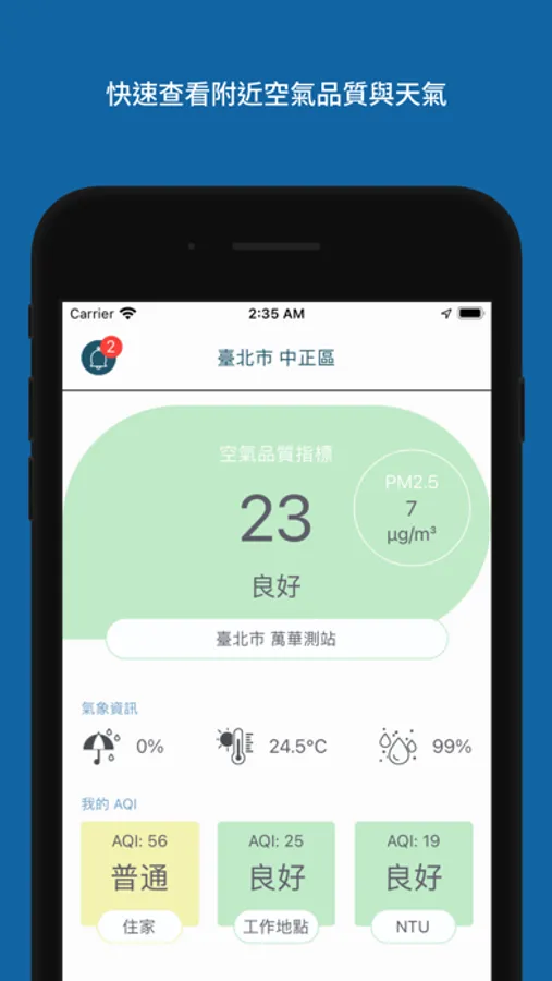 可將住家、工作與其他常用地點自訂於首頁,讓您一眼就可以關心自己與家人的健康。並可自訂空氣品質警報,提醒您與家人空品的變化。