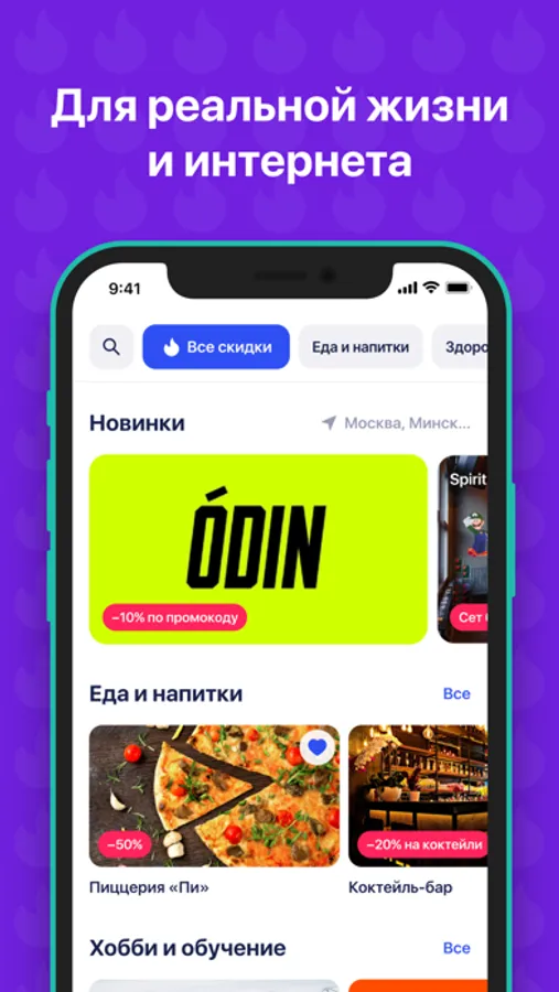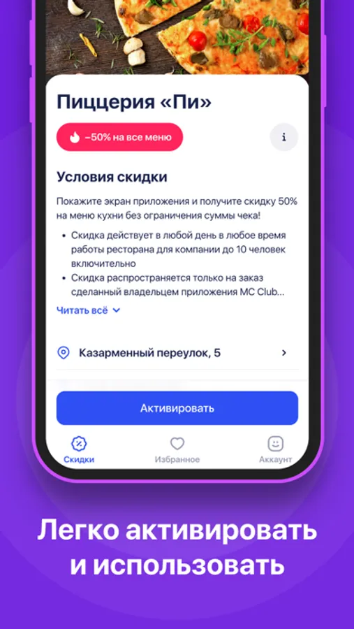 Находить нужные скидки легко: есть фильтры — например, «Еда и напитки», «Здоровье и красота», «Одежда», «Хобби и развлечения», а также описания заведения и условий скидки. Выбираешь, активируешь и экономишь!