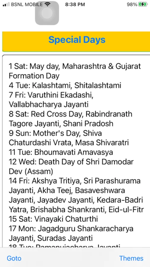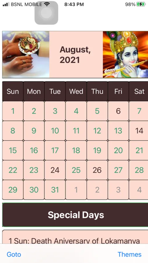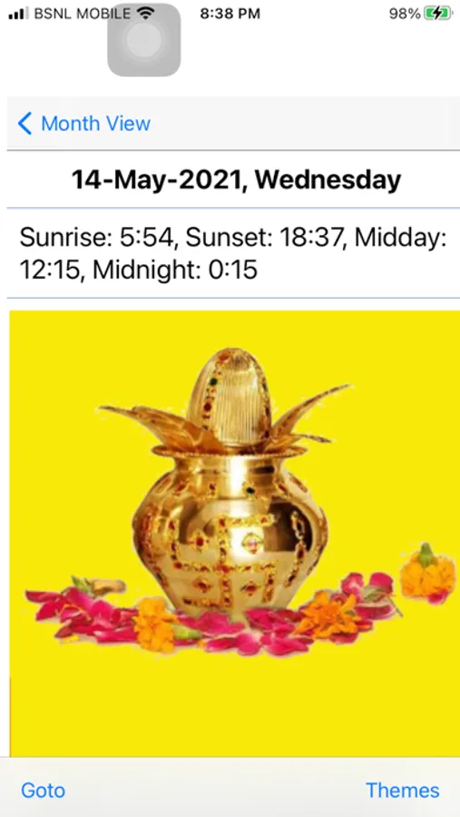 This calendar app shows the daily Indian Day, Tithi, Rasi and Nakshatra, Yoga, Karana along with their duration and the important days when you tap on a date. It also shows the local Sunrise and Sunset times as well as special times of the day like Choghadia, Rahukala, Gulikakala, Yamaganda, Varjyam, Abhijit and Amrita. Also, it shows daily Tara Shuddhi, Chandra Shuddhi, Rashi Shuddhi, Nakshatra Shuddhi, Tithi Shuddhi and Vara Shuddhi. Apart from these, it also shows pictures associated with some special days when you tap on a date.