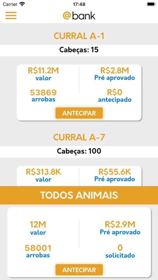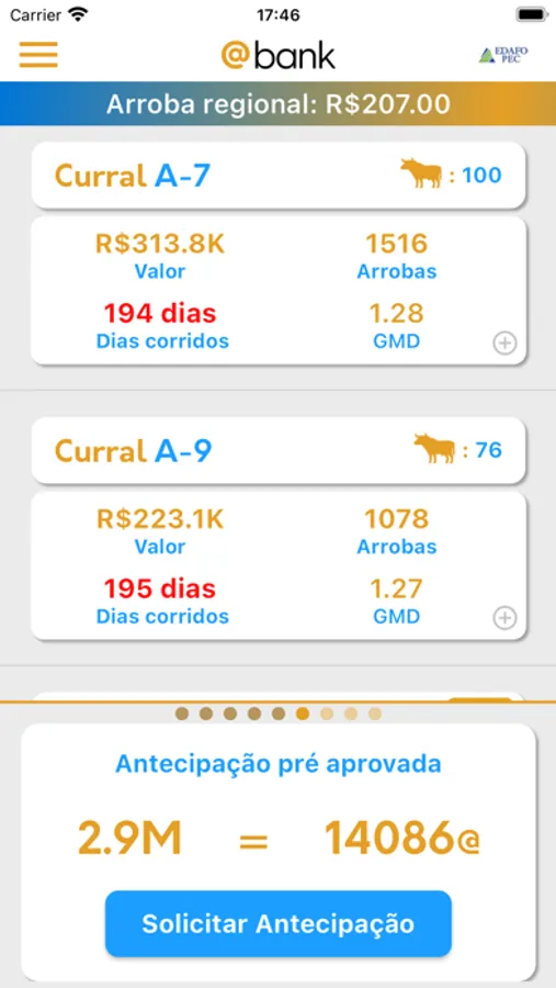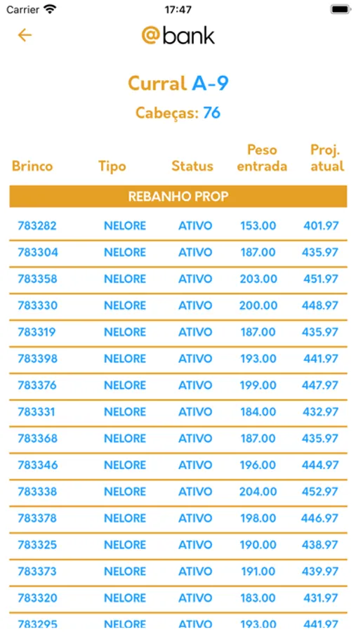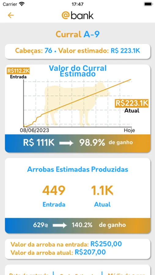 No @BANK você terá controle do seu rebanho com valores atualizados a todo momento e com histórico detalhado.