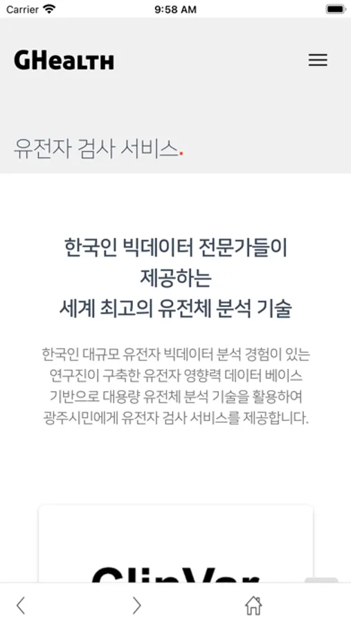 의료 정보, 생활 방식, 유전자에 걸친 다양한 정보를 바탕으로 개인맞춤 건강 관리를 위한 마이데이터 활용 통합건강 정보 서비스입니다.